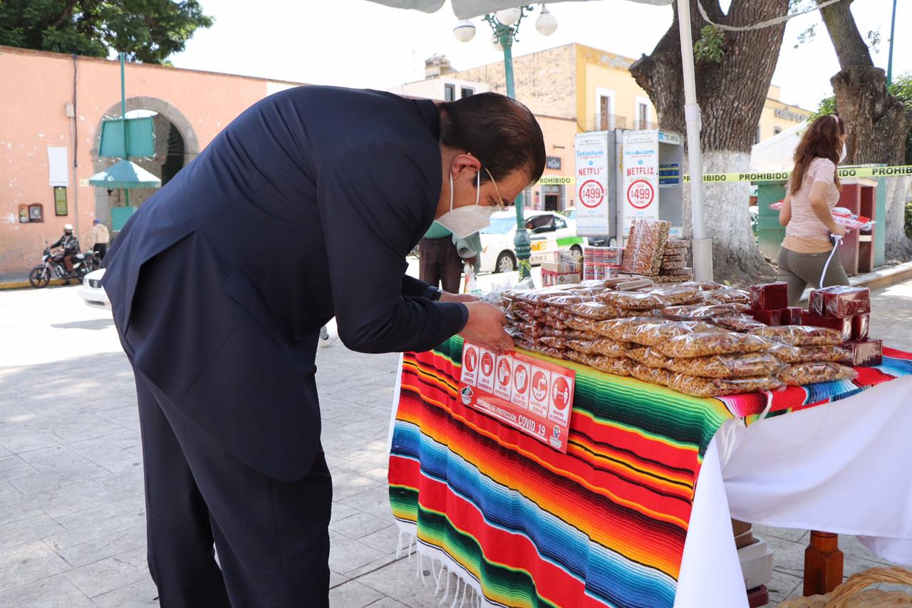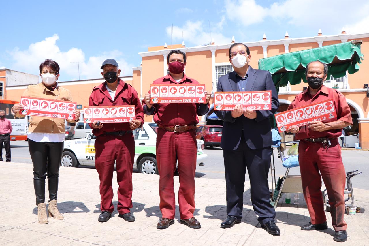 Huamantla, Tlax.- Con el objetivo de concientizar a la población en general y  como medida de prevención para reducir el número de contagios por COVID-19, el Presidente Municipal Jorge Sánchez Jasso, acompañado de su esposa y Presidenta del Sistema DIF Gabriela Escamilla Pérez, realizaron un recorrido con artesanos, prestadores de servicios turísticos, boleros, comercios en general, y transporte público para colocar calcomanías con las medidas sanitarias contra el SARS-CoV-2.