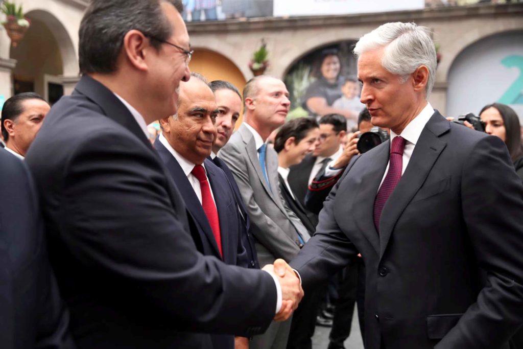 Tras el acto protocolario, el Gobernador Mena saludó al mandatario Alfredo del Mazo, a quien felicitó por el trabajo realizado en favor de las familias del Estado de México.