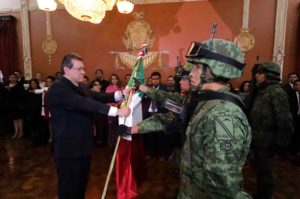 Acto seguido, se entonó el Himno Nacional Mexicano y el Gobernador Mena retornó al Salón Rojo del Palacio de Gobierno para entregar la Bandera Nacional a la escolta de la 23 Zona Militar.