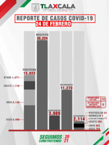De acuerdo con el reporte del 24 de febrero, la Secretaría de Salud del Estado (SESA) confirmó 38 personas recuperadas, 10 fallecimientos y 35 casos positivos de Covid-19 de tlaxcaltecas identificados en el estado y 8 en otras entidades.