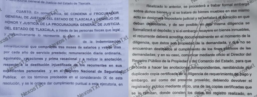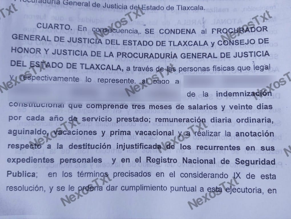 De acuerdo con el expediente 141/2019-3 del Tribunal de Justicia Administrativa (TJA), el Procurador del Estado, Aquiahuatl Sánchez y el Consejo de Honor y Justicia de la PGJ, fueron condenados al pago por concepto de indemnización constitucional, remuneración diaria ordinaria, aguinaldo, vacaciones, prima vacacional y a realizar la anotación respecto a la destitución injustificada de los oficiales de la Policía de Investigación.