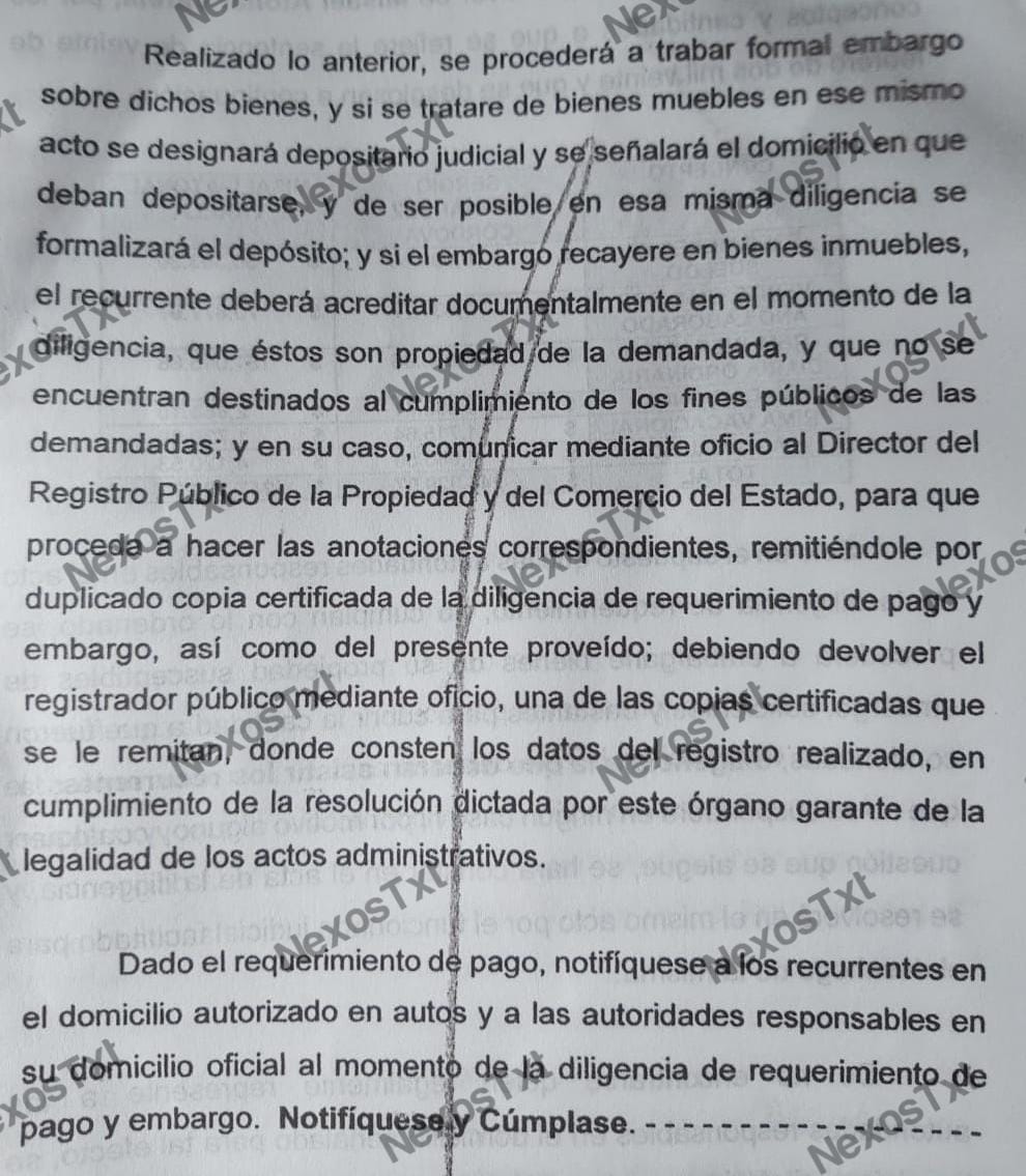 “Hecho el requerimiento sin que se verifique el pago al recurrente, se procederá al embargo de bienes, como ha quedado asentado en líneas precedentes, el derecho a designar los bienes susceptibles de embargo, y que hayan de embargarse, corresponde las autoridades responsables, y solo que éstas se rehúsen o estén ausentes, podrá ejercitarlo el recurrente”, así precisó el documento.