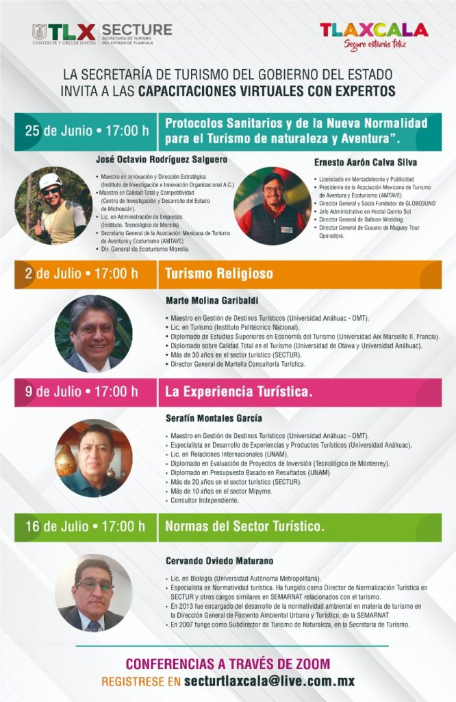 La Secretaría de Turismo del Estado (Secture) dio a conocer que las capacitaciones en línea dirigidas a prestadores de servicios del sector que se ofrecen como parte de la campaña “Quédate En Casa”, contemplan la participación de expertos de distintos estados del país, que cuentan con una amplia experiencia laboral en el ramo.