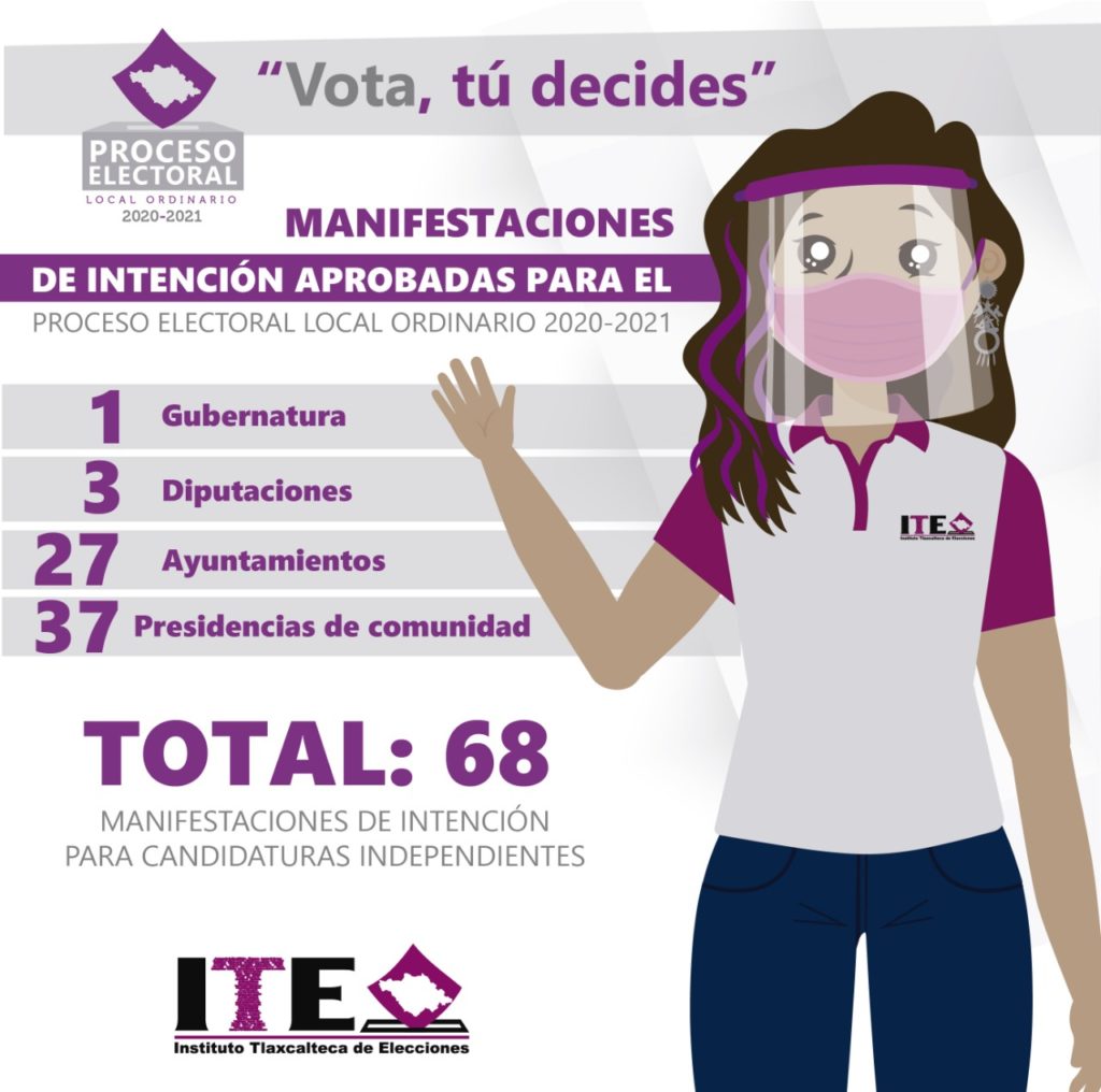 El Instituto Tlaxcalteca de Elecciones (ITE) aprobó este 24 de diciembre la procedencia de otras 49 manifestaciones de intención de personas que obtienen la calidad de aspirantes a candidaturas independientes para el Proceso Electoral Local Ordinario 2020-2021.