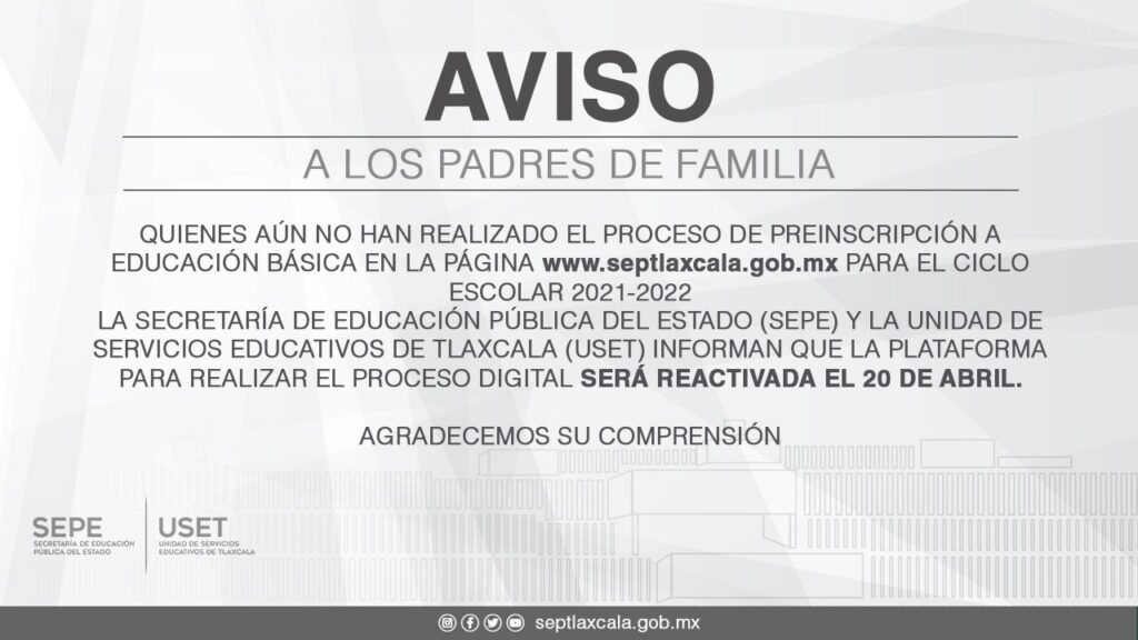 La Secretaría de Educación Pública del Estado (SEPE) y la Unidad de Servicios Educativos de Tlaxcala (USET) informan a los padres de familia o tutores, quienes aún no han realizado el proceso de preinscripción a educación básica en la página www.septlaxcala.gob.mx, que la plataforma para realizar el proceso digital será reactivada el día 20 de abril.