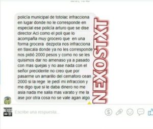 El afectado aseguró a NexosTXT a través de su denuncia, que se negó a prestarse a los actos de corrupción de la policía de Totolac, pero dijo que no podía presentar su queja, pues el propio alcalde perredista, Giovanni Pérez Briones, está involucrado, pues exige una cantidad mensual a los oficiales.