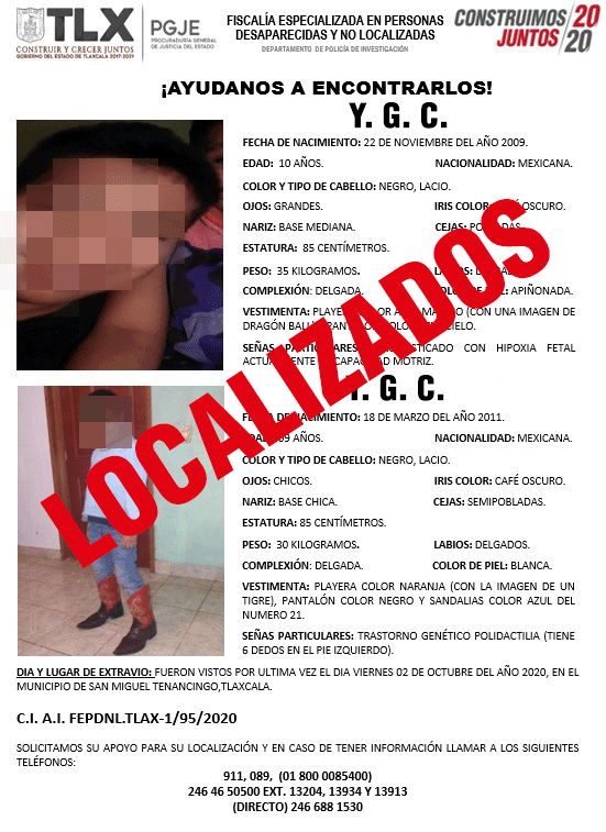 Sin embargo, días posteriores la madre de los menores se presentó ante la Fiscalía Especializada en Personas Desaparecidas y No Localizadas para informar que sus hijos salieron de su domicilio acompañados de uno de sus tíos para llevarlos a vivir al estado de Puebla.