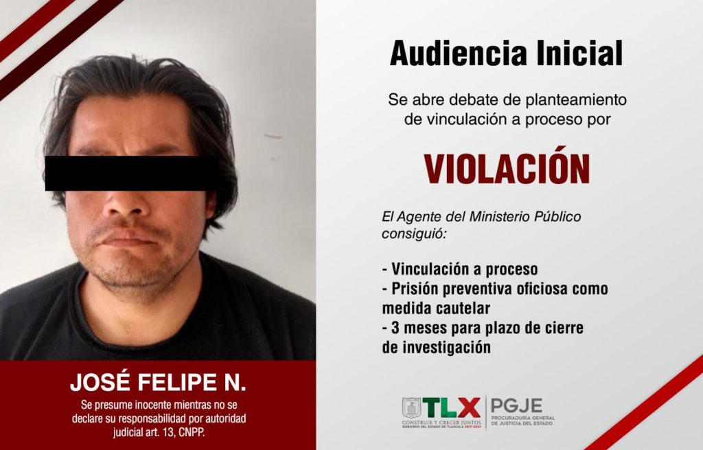 La Procuraduría General de Justicia del Estado (PGJE) obtuvo de un Juez de Control la vinculación a proceso con prisión preventiva oficiosa contra José Felipe N., por el delito de violación en agravio de su hija de 12 años de edad.