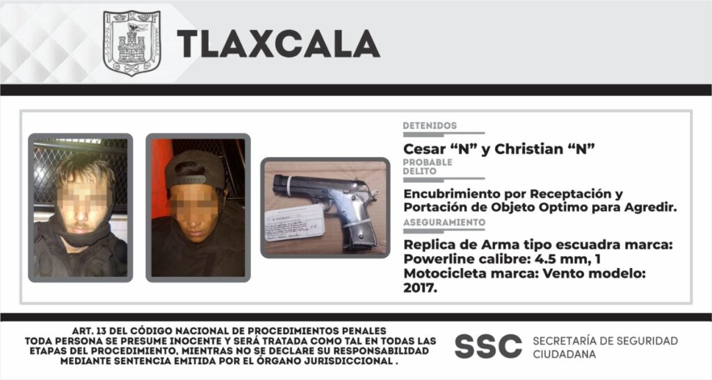 Personal de la Dirección de Seguridad Delegación Tlaxcala pertenecientes a la Secretaría de Seguridad Ciudadana (SSC), por medio de acciones enfocadas a la prevención y combate al delito, detuvo este fin de semana en el municipio de Tlaxcala, a dos personas por la portación ilegal de una réplica de arma de fuego y un motocicleta marca Vento con reporte de robo.