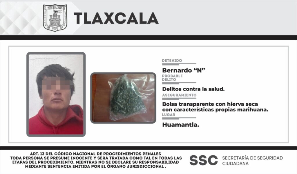 La Secretaría de Seguridad Ciudadana (SSC) a través de acciones inherentes para la prevención y combate de los delitos, detuvo el jueves a una persona en el municipio de Huamantla por posesión de enervantes.