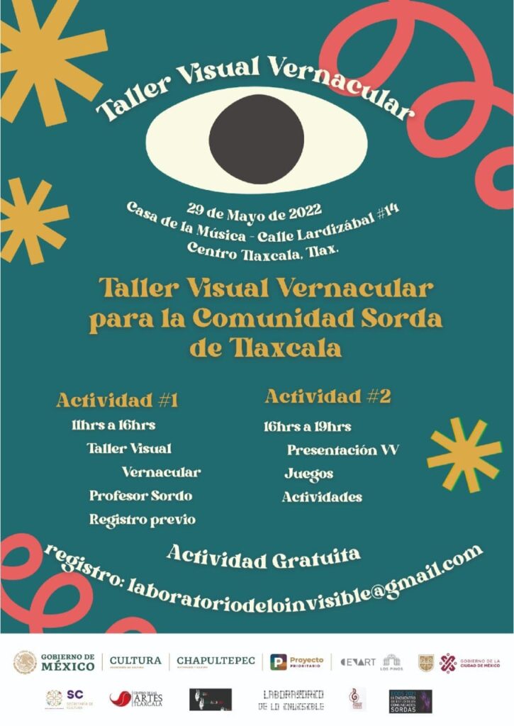 La Secretaría de Cultura del estado de Tlaxcala, en coordinación con el proyecto Chapultepec, Naturaleza y Cultura, de la Secretaría de Cultura federal y el Centro Nacional de las Artes (CENART), presenta el Taller Visual Vernacular para la comunidad sorda de Tlaxcala.