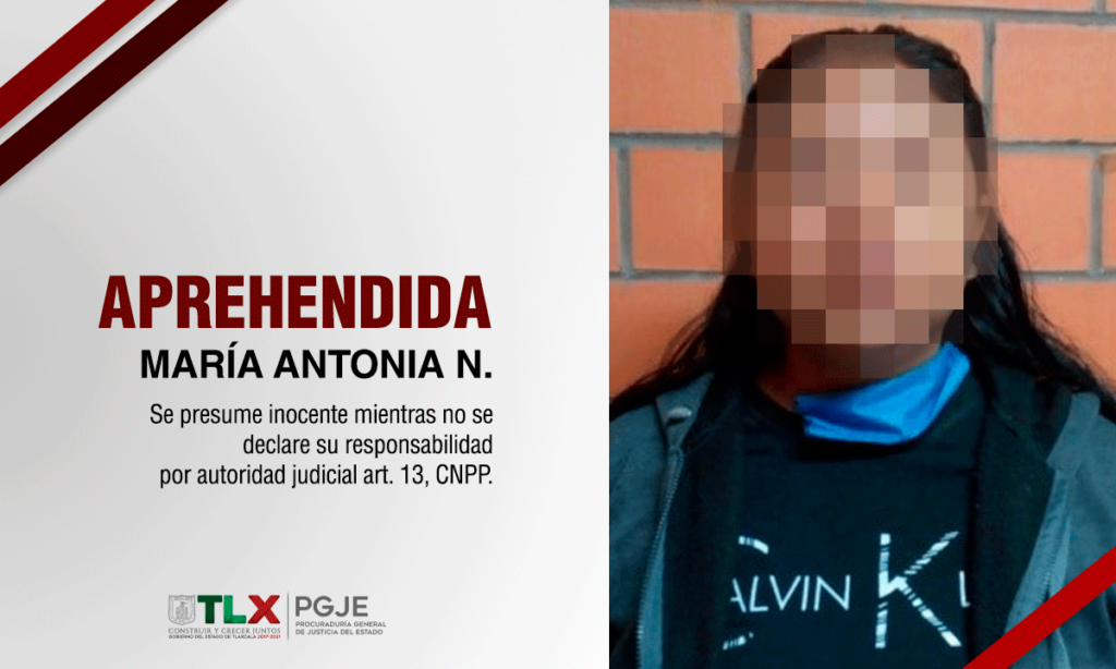 Resultado de este trabajo operativo, los investigadores ubicaron a la indiciada la mañana del 8 de julio en el municipio de Totolac, por lo que de inmediato María Antonia N., de 35 años de edad y vecina del municipio de Ixtacuixtila, fue asegurada y llevada a las instalaciones de la PGJE.