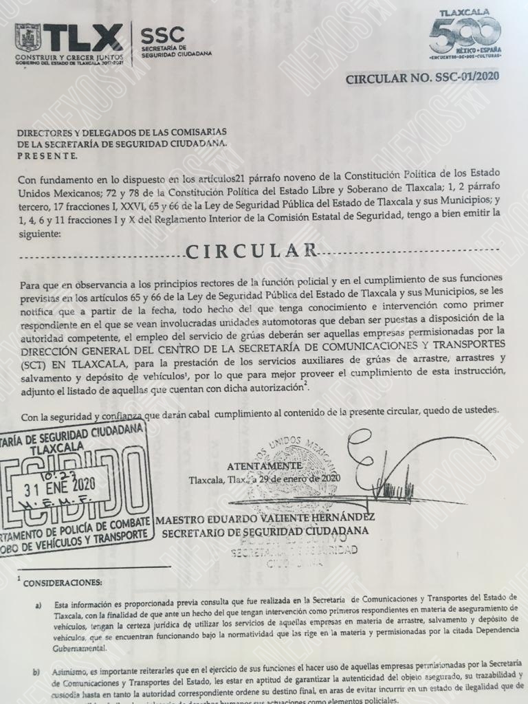 NexosTXT tuvo acceso a la circular número: SSC-01-2020, la cual fue dirigida a los Directores de las policías municipales y a los delegados de las comisarías de la SSC, para que “todo hecho de que tenga conocimiento e intervención como primer respondiente en el que se vean involucradas unidades automotoras que deban ser puestas a disposición de la autoridad competente, el empleo del servicio de grúas deberán ser aquellas empresas permisionadas por la Dirección General de la Secretaría de Comunicaciones y Transportes (SCT) en Tlaxcala, para la prestación de los servicios auxiliares de grúas de arrastre, salvamento y depósito de vehículos”.