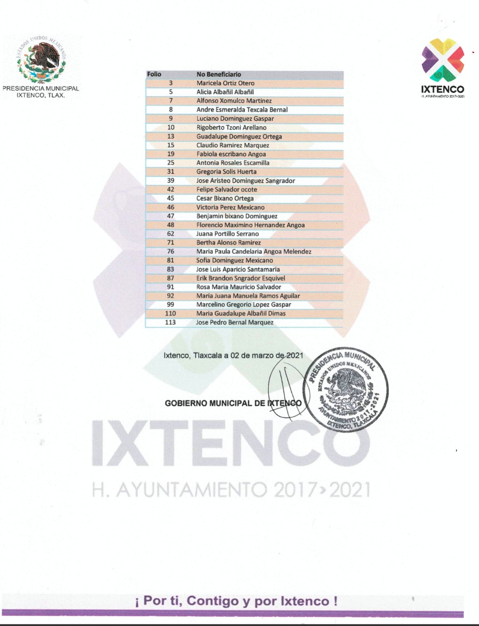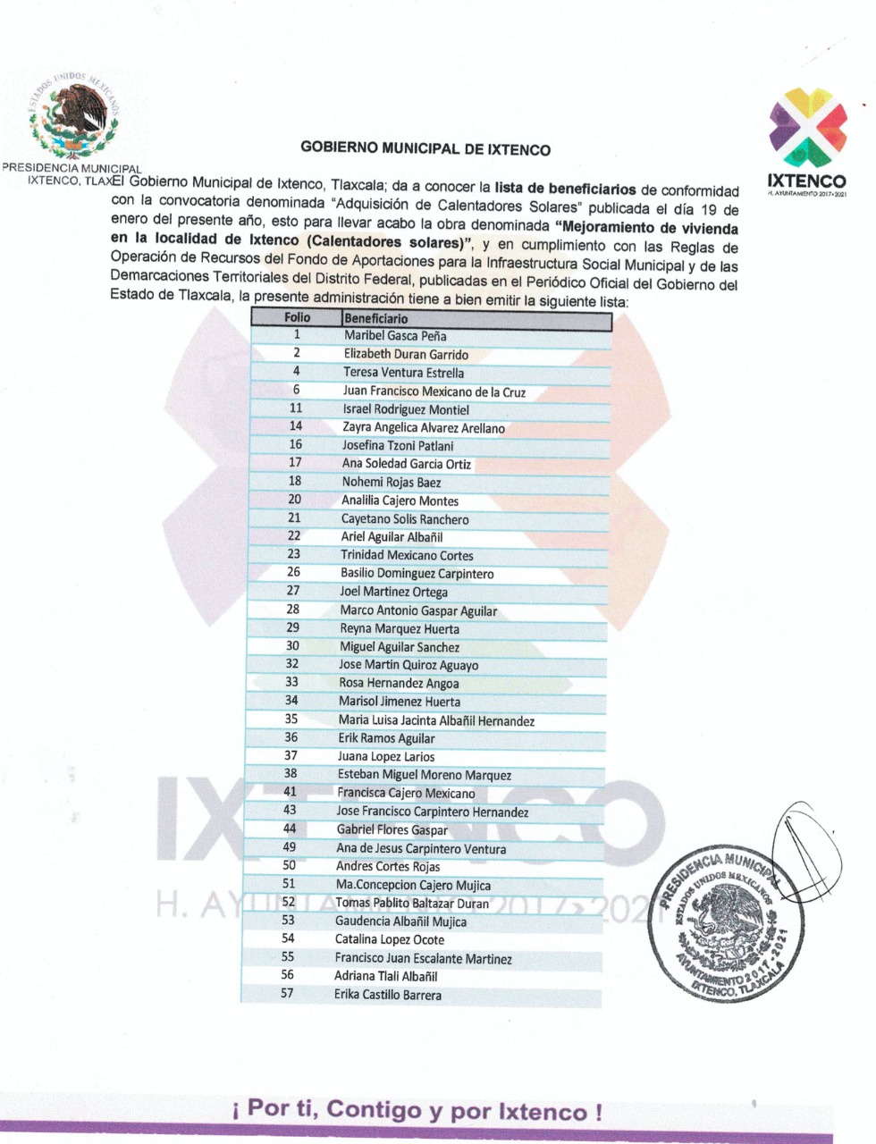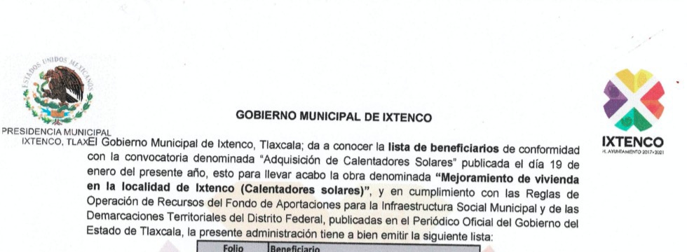 El Gobierno Municipal de Ixtenco, dio a conocer la lista de beneficiarios del programa denominado: “Adquisición de Calentadores Solares”, el programa inicio el día 19 de enero del presente año y hoy concluyó con la publicación de las listas de beneficiarios.