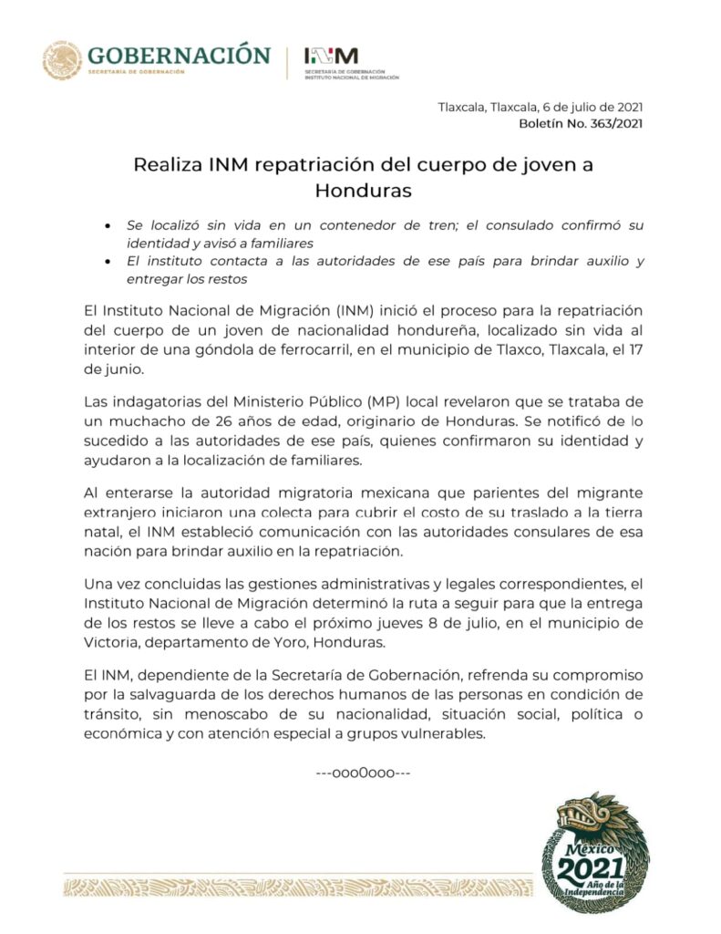 El Instituto Nacional de Migración (INM) inició el proceso para la repatriación del cuerpo de un joven de nacionalidad hondureña, localizado sin vida al interior de una góndola de ferrocarril, en el municipio de Tlaxco, Tlaxcala, el 17 de junio.