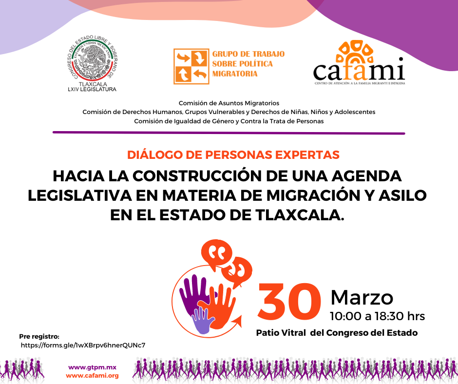 La Comisión de Asuntos Migratorios, la Comisión de Derechos Humanos, Grupos Vulnerables y Derechos de Niñas, Niños y Adolescentes; y la de Igualdad de Género y Contra la Trata de Personas, presididas respectivamente por el Diputado Rubén Terán Águila, la Diputada Diana Torrejón Rodríguez, y la Diputada Lorena Ruiz García, bajo la coordinación del Centro de Atención a la Familia Migrante Indígena (CAFAMI) y el Grupo de Trabajo sobre Política Migratoria (GTPM), realizarán el próximo 30 de marzo en punto de las 10:00 horas, el Diálogo de personas expertas “Hacia la Construcción de una Agenda Legislativa en Materia de Migración y Asilo en el Estado de Tlaxcala”.