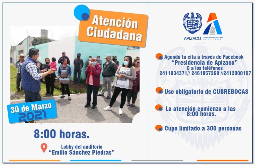En este sentido y cumpliendo las medidas de sanidad, se invita a la ciudadanía hacer su previo registro a través de Facebook “Presidencia de Apizaco” o a los teléfonos 2411934371,2461857268 y 2412000107.