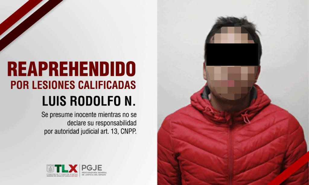 Resultado del seguimiento a las indagatorias radicadas, la Procuraduría General de Justicia del Estado (PGJE) a través del trabajo de la Policía de Investigación, cumplimentó una orden de reaprehensión en contra de Luis Rodolfo N., por el delito de lesiones calificadas.