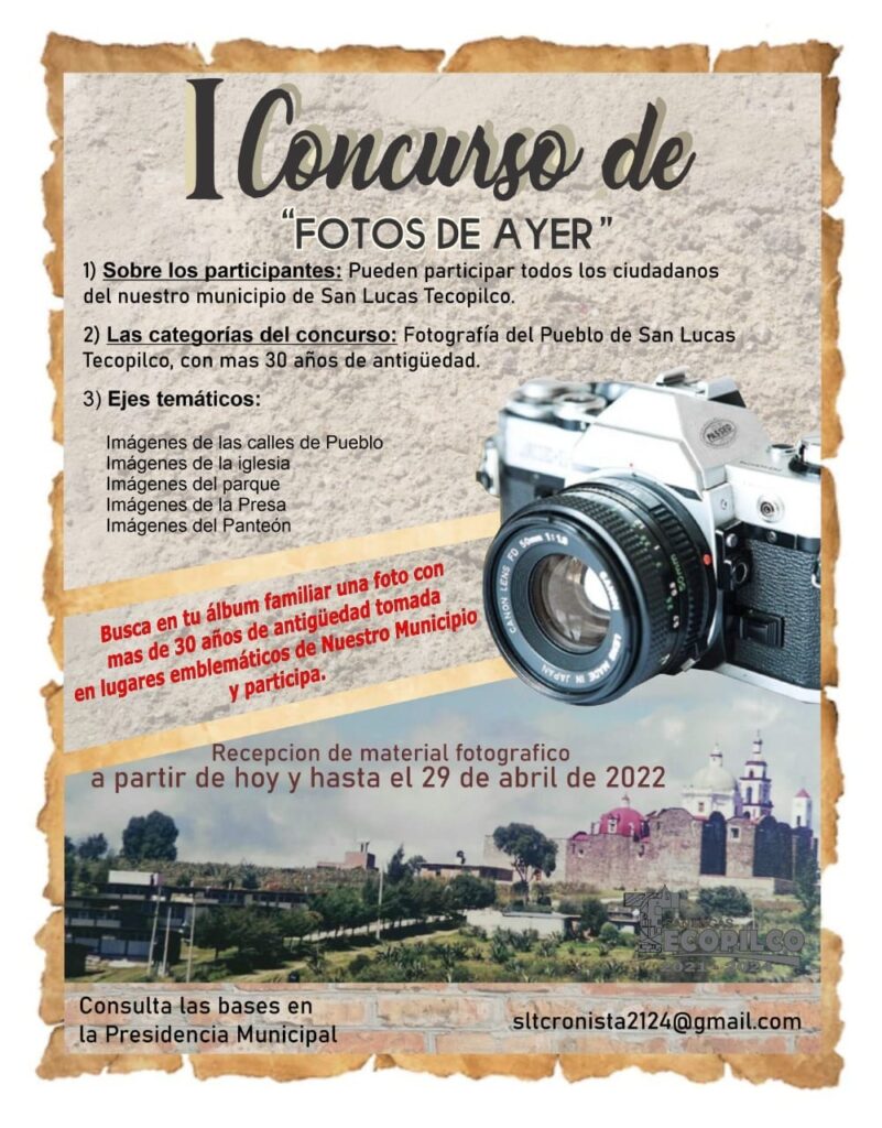 El ayuntamiento de San Lucas Tecopilco, invitó a todos los vecinos del municipio a participar en el primer concurso denominado “Fotos del ayer”, cuyas imágenes deben tener mínimo 30 años de antigüedad.