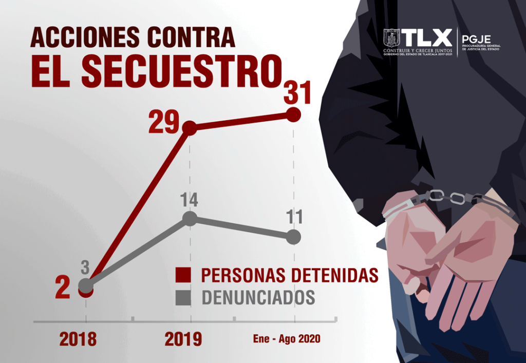 Resultado del fortalecimiento y equipamiento de áreas dedicadas al combate de delitos de alto impacto, la Procuraduría General de Justicia del Estado (PGJE) ha capturado de 2018 a 2020, a 62 personas involucradas en secuestros cometidos en la entidad y otros estados, mismas que se encuentran actualmente a disposición de las autoridades jurisdiccionales correspondientes.