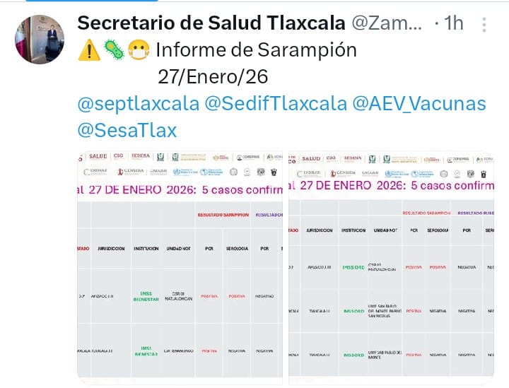 Cabe mencionar que el jueves 22 de enero se reportó un supuesto caso de sarampión en una bebé de seis meses, del municipio de Huamantla; sin embargo, tras el resultado de la genotipificación que realizó el Instituto de Diagnóstico y Referencia Epidemiológicos (InDRE), se reclasificó como un Evento Supuestamente Atribuible a Vacunación o Inmunización (ESAVI), al tratarse de una reacción a virus posvacuna, ya que no tenía todo el cuadro clínico relacionado a sarampión.