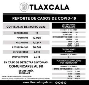Los datos de la SESA registrados en la plataforma nacional del Sistema de Vigilancia Epidemiológica de Enfermedades Respiratorias (Sisver), confirmaron 12 casos positivos de Covid-19 y cero defunciones, el 27 de marzo de 2022 en la entidad.
