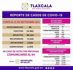 La SESA confirmó 96 casos positivos y tres defunciones el 15 de septiembre de 2021.