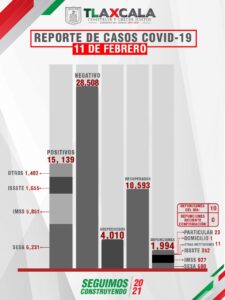 De acuerdo con el reporte del 11 de febrero, la Secretaría de Salud del Estado (SESA) confirmó 93 personas recuperadas, 10 fallecimientos y 69 casos positivos de Covid-19 de tlaxcaltecas identificados en el estado y tres en otras entidades.