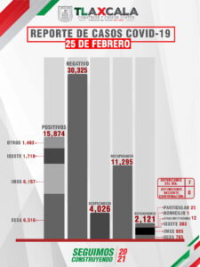 De acuerdo con el reporte del 25 de febrero, la Secretaría de Salud del Estado (SESA) confirmó 25 personas recuperadas, 7 fallecimientos y 44 casos positivos de Covid-19 de tlaxcaltecas identificados en el estado y 7 en otras entidades.