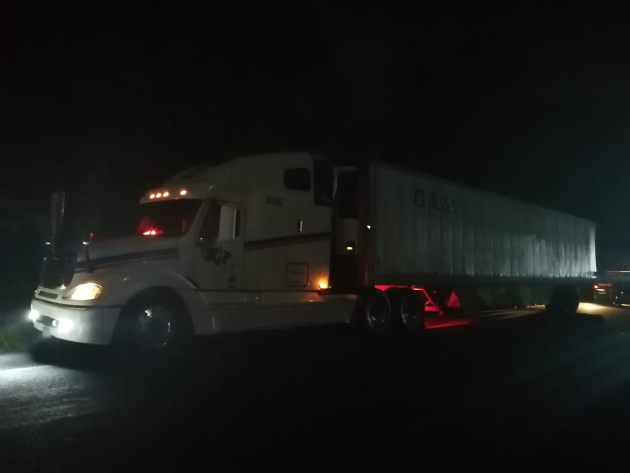 Tiempo después los policías municipales durante un recorrido de seguridad y vigilancia por la carretera que lleva a la comunidad del Carmen Xalpatlahuaya a la altura del tramo Huamantla-San Martin Notario, se percataron que se encontraba varado un tracto camión de la Marca Freightliner, color blanco, con franjas de color azul y naranja, placas de circulación 38-AL-4H del SPF y acoplada una caja refrigerante de color blanco de la Marca Hyundai, con placas de circulación 153-XB-4 del SPF, en calidad de abandonado.