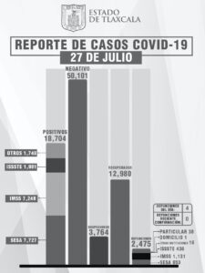 De acuerdo con el reporte del 27 de julio, la Secretaría de Salud del Estado (SESA) confirmó 13 personas recuperadas, cuatro fallecimientos y 40 casos positivos de Covid-19 de tlaxcaltecas identificados en el estado y cinco en otras entidades.