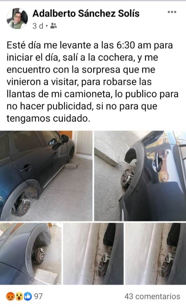 Sánchez Solís hizo la denuncia a través de su cuenta personal de Facebook, sobre el robo de los neumáticos de su camioneta: “lo publico no para hacer publicidad, si no para tengamos cuidado”, mencionó