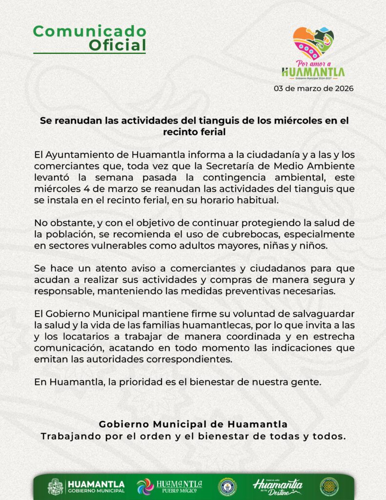 El Ayuntamiento de Huamantla informa a la ciudadanía y a las y los comerciantes que, toda vez que la Secretaría de Medio Ambiente levantó la semana pasada la contingencia ambiental, este miércoles 4 de marzo se reanudan las actividades del tianguis que se instala en el recinto ferial, en su horario habitual.