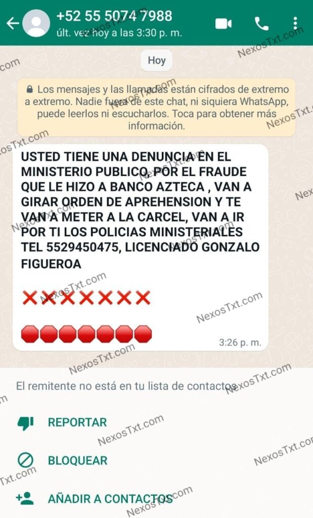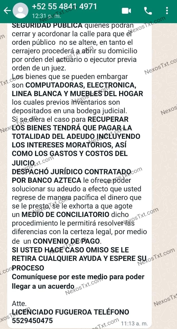 “Usted tiene una denuncia en el Ministerio público por el fraude que le hizo a Banco Azteca, van a girar orden de aprehensión y te van a meter a la cárcel, van a ir por ti los policías ministeriales, Tel 5529450475, lic Gonzalo Figueroa.