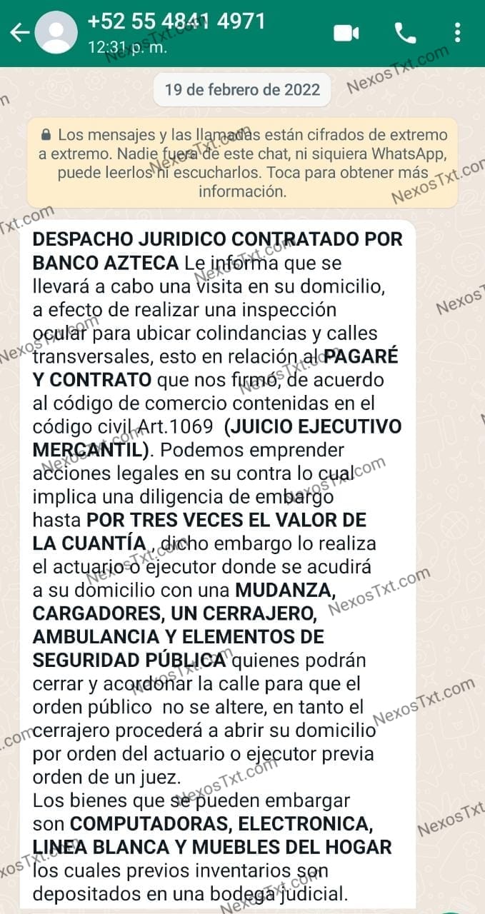 En otros casos, el mismo número telefónico se hace pasar por un “Despacho jurídico” que fue contratado por Banco azteca a efecto de que se cumplimente una orden de embargo por una supuesta deuda por un préstamo más intereses.