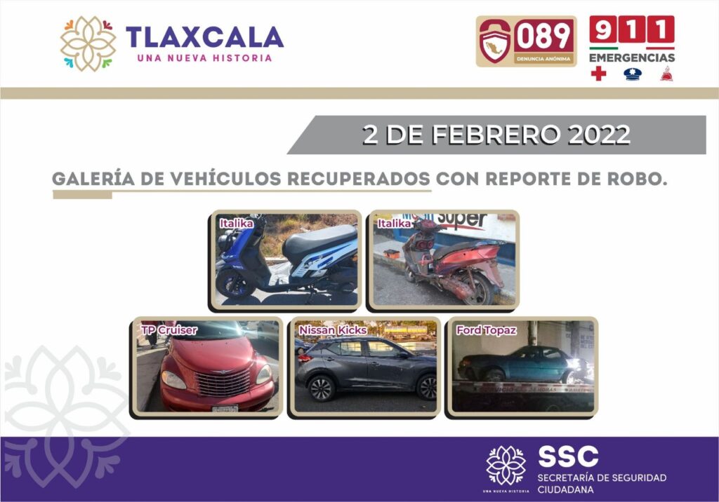 Las acciones tuvieron lugar en los municipios de Texoloc, Tlaxcala, Zacatelco, Chiautempan y Totolac, donde los elementos de seguridad en acciones distintas aseguraron dos motocicletas de la marca ItaliKa, un automóvil Chrysler Cruiser, una camioneta Nissan kicks, y un vehículo Ford Topaz.