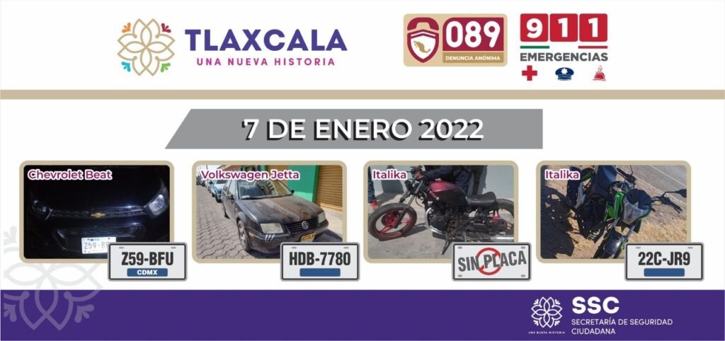 Las acciones tuvieron lugar en los municipios de Apizaco, Tlaxcala, Tlaxco y San Pablo Apetatitlán donde los elementos de seguridad, en acciones distintas, aseguraron dos motocicletas de la marca Italika, un auto Volkswagen, tipo Jetta A4, y un Sedan Chevrolet, tipo Beat.