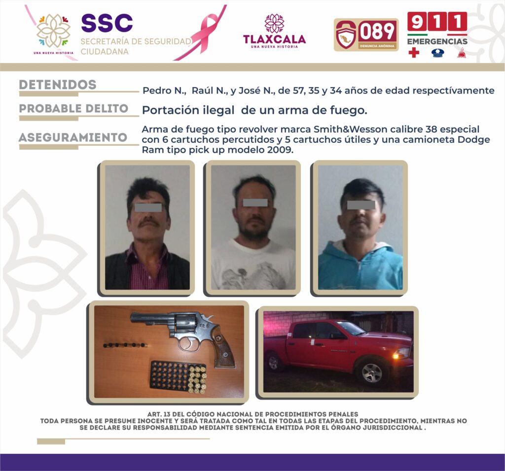 En el marco de las acciones de prevención implementadas para inhibir todo acto delictivo en la entidad, elementos de la Secretaría de Seguridad Ciudadana (SSC) a través de su Dirección de Seguridad región Tlaxco, realizaron la detención de tres personas por el probable delito de portación ilegal de armas de fuego y cartuchos útiles.