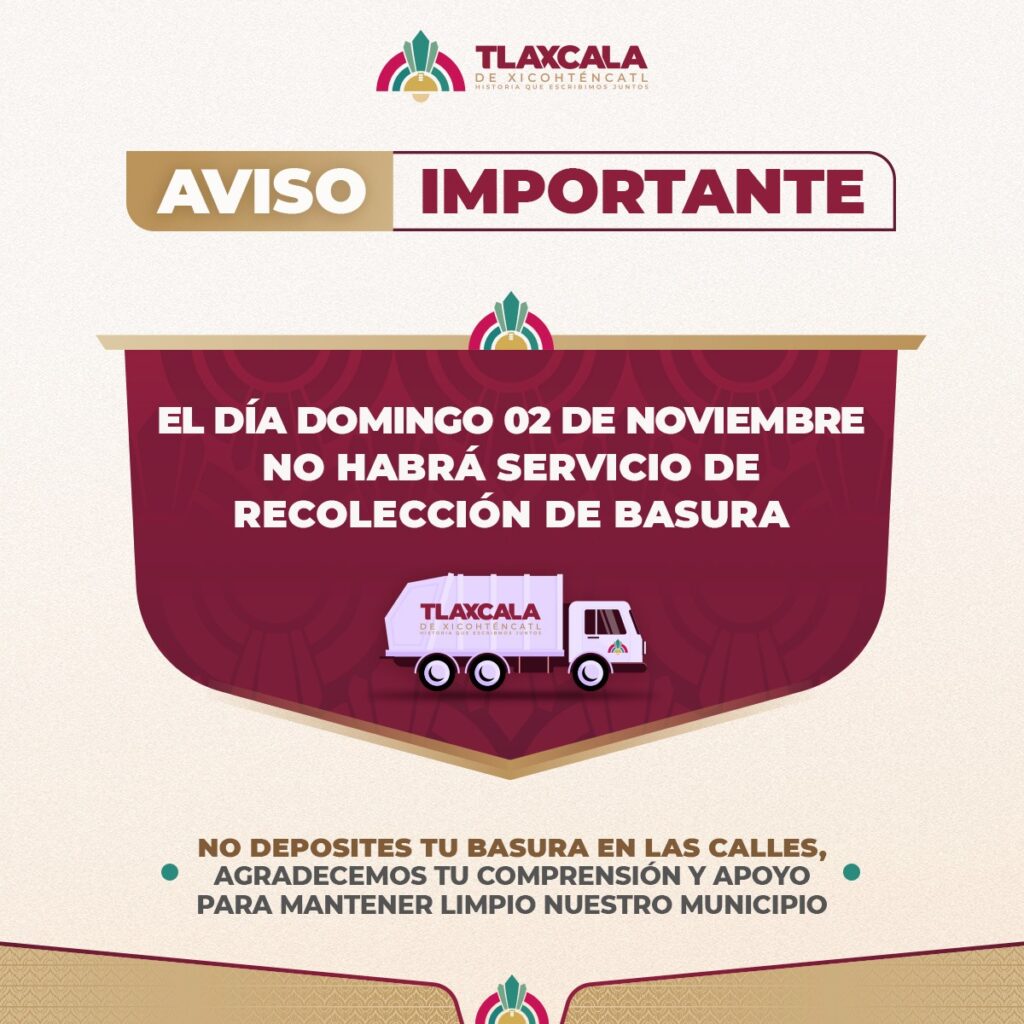 El Ayuntamiento de Tlaxcala informa que este domingo 2 de noviembre, con motivo de la celebración del Día de Muertos, se suspenderá el servicio de recolección de basura en toda la capital.