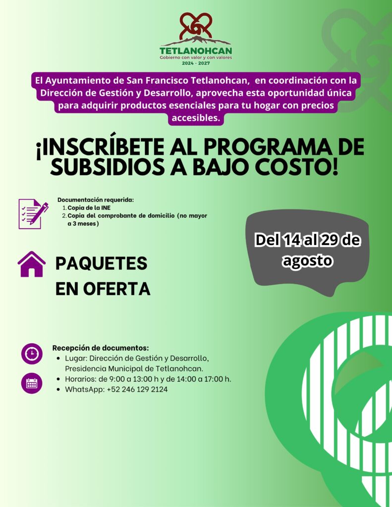 El H. Ayuntamiento de San Francisco Tetlanohcan, que encabeza la presidenta municipal Kritsbey Pérez Flores, anunció la apertura del Programa de Subsidios a Bajo Costo, una estrategia municipal para que las familias accedan a productos y equipos esenciales del hogar a precios accesibles.