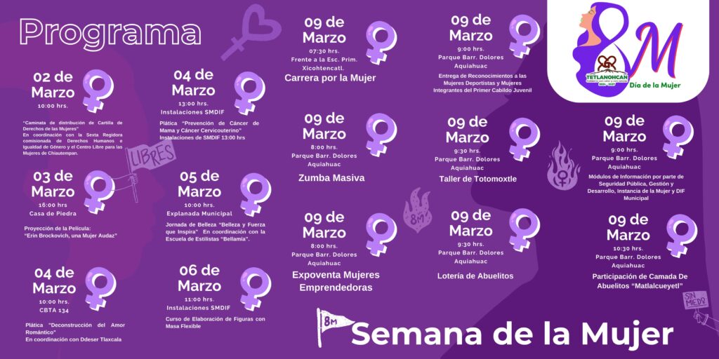 En el marco del Día Internacional de la Mujer, el Gobierno Municipal de Tetlanohcan ha preparado un programa integral de actividades del 2 al 9 de marzo, con el objetivo de reconocer, fortalecer y visibilizar la participación de las mujeres en los distintos ámbitos de la vida pública, social, cultural y económica del municipio.