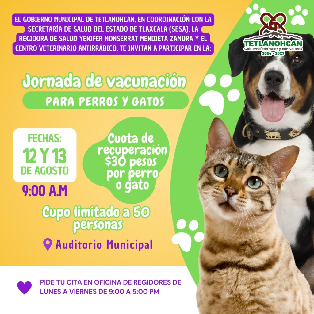 Tetlanohcan, Tlaxcala. El Gobierno Municipal de Tetlanohcan 2024–2027, en coordinación con la Secretaría de Salud del Estado de Tlaxcala (SESA), la Regidora de Salud Yenifer Monserrat Mendieta Zamora y el Centro Veterinario Antirrábico, llevarán a cabo una Jornada de Vacunación para perros y gatos, como parte de las acciones de prevención en salud pública.