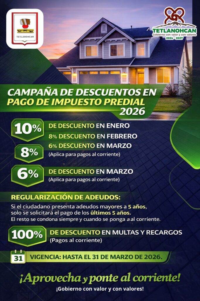 El H. Ayuntamiento de San Francisco Tetlanohcan anunció el inicio de la Campaña de Descuentos en el Pago del Impuesto Predial 2026, con el objetivo de apoyar la economía de las familias del municipio y fomentar la regularización oportuna de sus obligaciones fiscales.