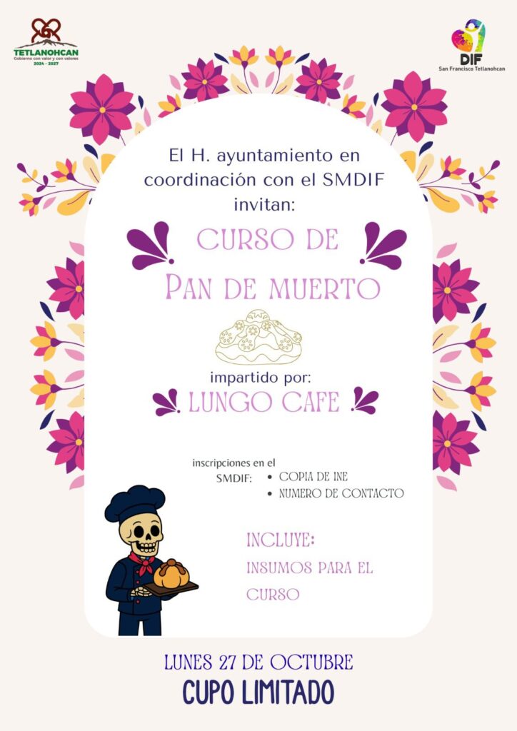 El H. Ayuntamiento de San Francisco Tetlanohcan, en coordinación con el Sistema Municipal DIF, invita a la población a participar en el Curso de Pan de Muerto, que será impartido por Lungo Café el próximo lunes 27 de octubre.