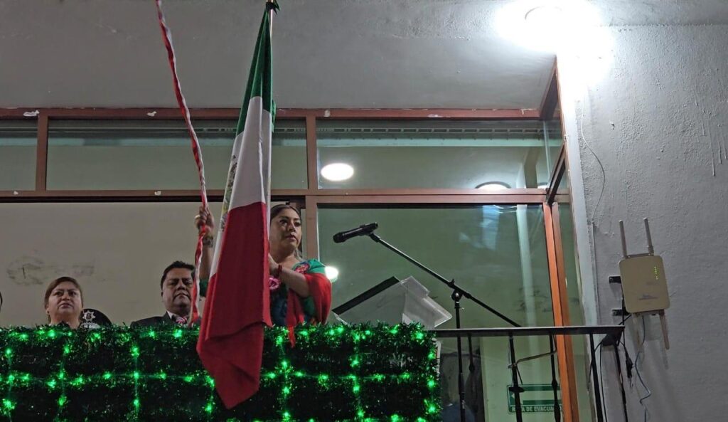 Ante una explanada municipal llena de color, música y familias reunidas, la presidenta ondeó con firmeza la Bandera Nacional y tocó la campana, proclamando los vivas que retumbaron en cada rincón: