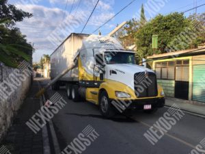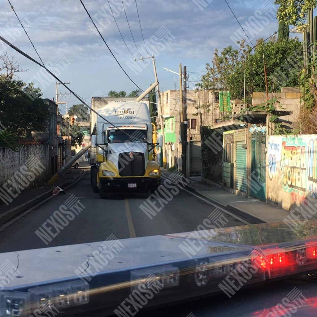 Un tráiler atoró y jaló con la caja seca acoplada al tractor, varios cables de energía de la Comisión Federal de Electricidad (CFE) y de la empresa IZZI, que abastece de telefonía, Internet y televisión de paga a las viviendas que se ubican en la calle Xicohténcatl, de Acxotla del Río, y los dejó sin los servicios, pues también derribó un poste de concreto.