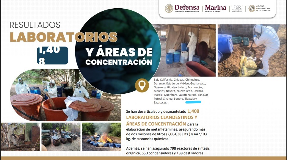 De acuerdo con reportes de la Sedena, Marina, FGR y el Centro Nacional de Inteligencia, los operativos dejaron como saldo la incautación de toneladas de precursores químicos, maquinaria especializada y armas, además de la detención de presuntos operadores ligados al Cártel de Sinaloa.