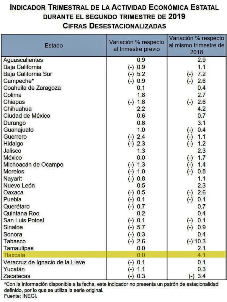 Tlaxcala creció 4.1 puntos porcentuales durante el segundo trimestre de 2019 en el Indicador Trimestral de la Actividad Económica Estatal del Inegi, con lo que se colocó en segundo lugar nacional solo una décima detrás de la primera posición de los estados con mayor tasa de crecimiento anual.