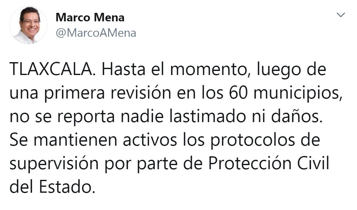 En sus cuentas de Twitter y Facebook, el Gobernador Mena publicó: “TLAXCALA. Hasta el momento, luego de una primera revisión en los 60 municipios, no se reporta nadie lastimado ni daños. Se mantienen activos los protocolos de supervisión por parte de Protección Civil del Estado”.