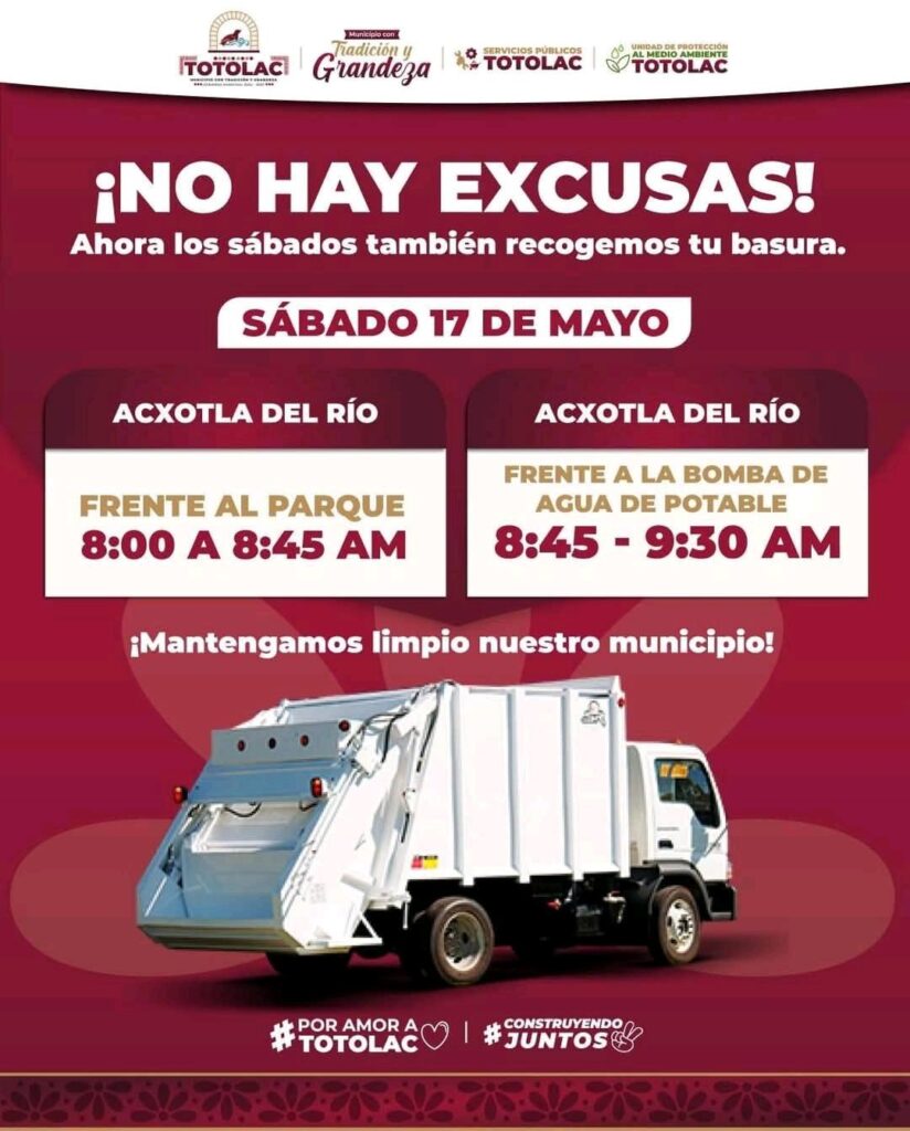 El Gobierno Municipal de Totolac 24-27, bajo la administración del presidente Benjamín Atonal Conde, informa a la ciudadanía que, para facilitar el manejo de los residuos y mantener el municipio limpio, se amplía el servicio de recolección de basura con la colocación de un compactador en lugares públicos, además de los recorridos habituales.